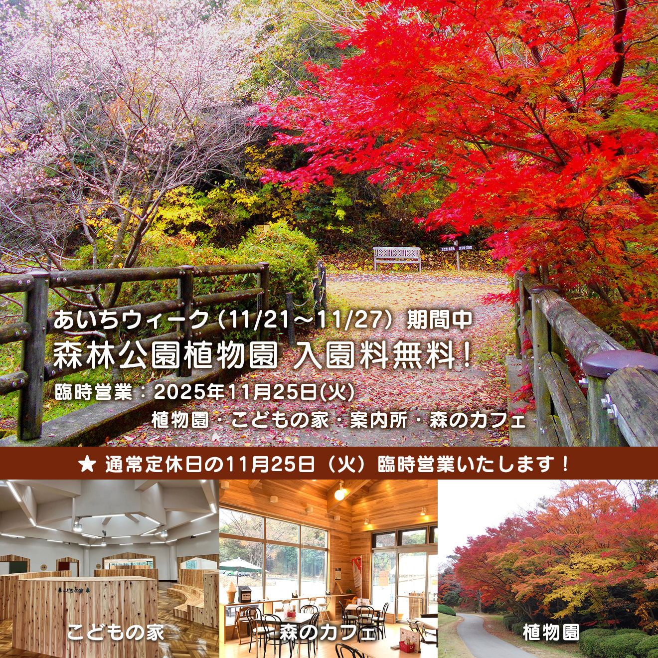 愛知県森林公園では通常定休日の11月25日(火)を臨時営業(植物園・こどもの家・案内所・森のカフェ)し、期間中は植物園入園料が無料になります。