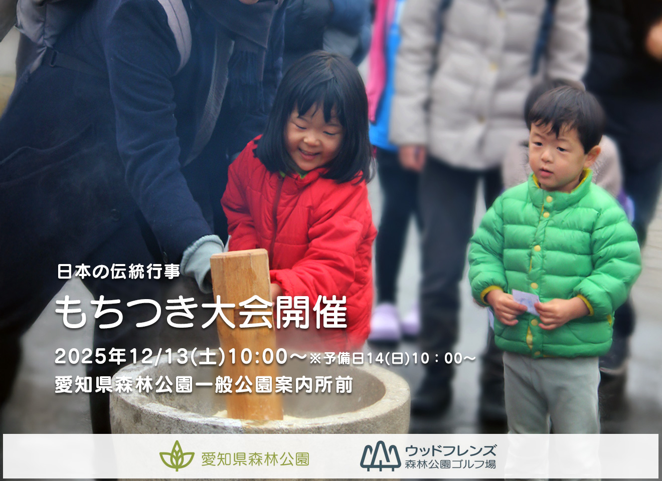 森林公園恒例のもちつき大会を、12月13日(土)10:00より開催いたします。つきたてのお餅は、今年一年の感謝の気持ちを込めて、無料でご来場の方々に振る舞います。(お一人様1皿限り)また、小学生以下のお子さま限定で、もちつき体験もしていただけます。一足早いですが、来年も益々の健康と発展を祈念して、美味しいおもちをつきましょう!